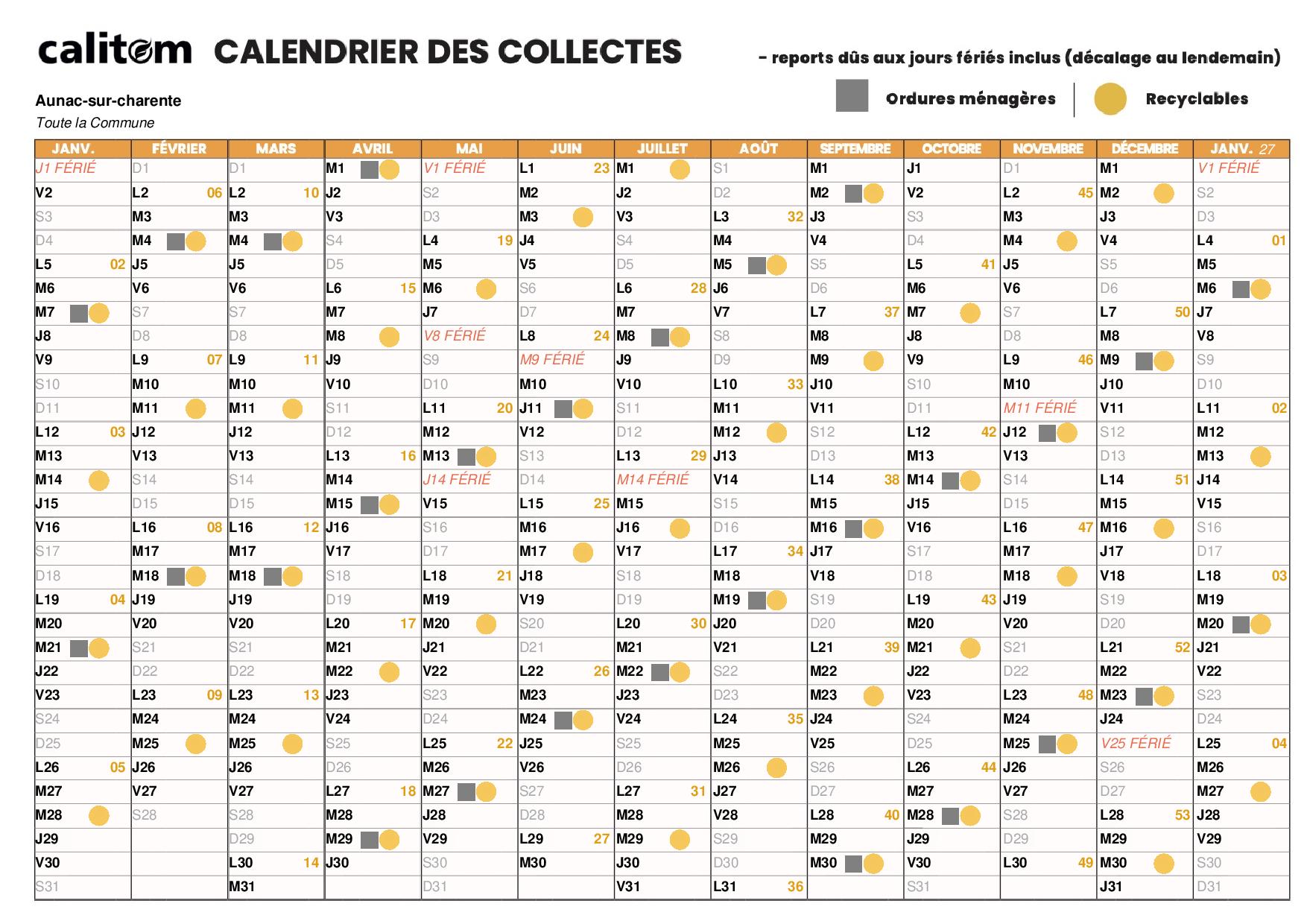 Les Calendriers de collecte d’Aunac sr Charente pour les SACS JAUNES et les SACS NOIRS sont téléchargeables ci dessous